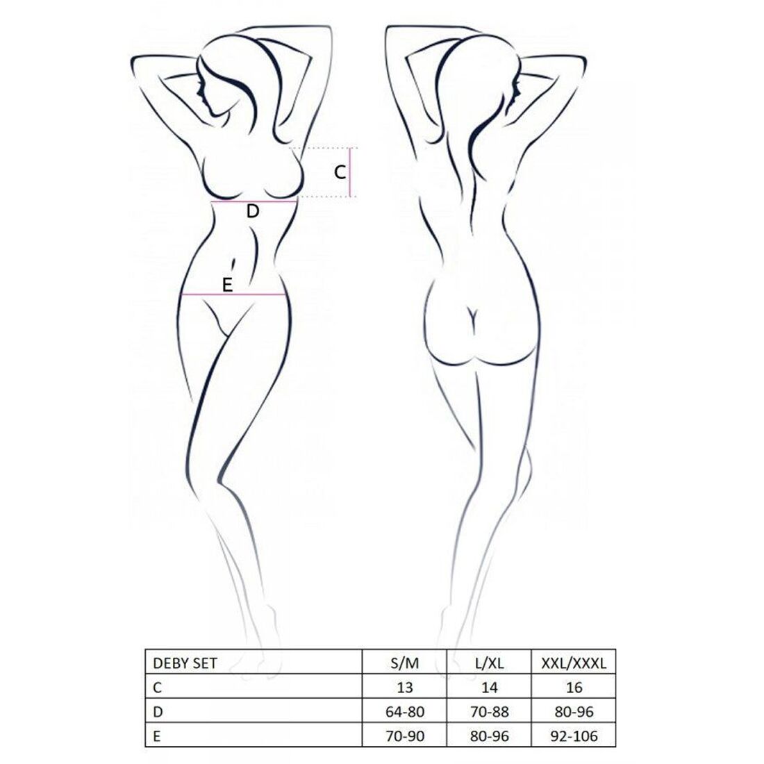 Рекомендуємо купити комплект DEBY SET black S/M – Passion, що складається зі сміливого бюстгальтера з вирізом, трусиків і неймовірно сексуальної міні-спіднички. Лаковий, але м'який матеріал робить набір особливо пікантним.
