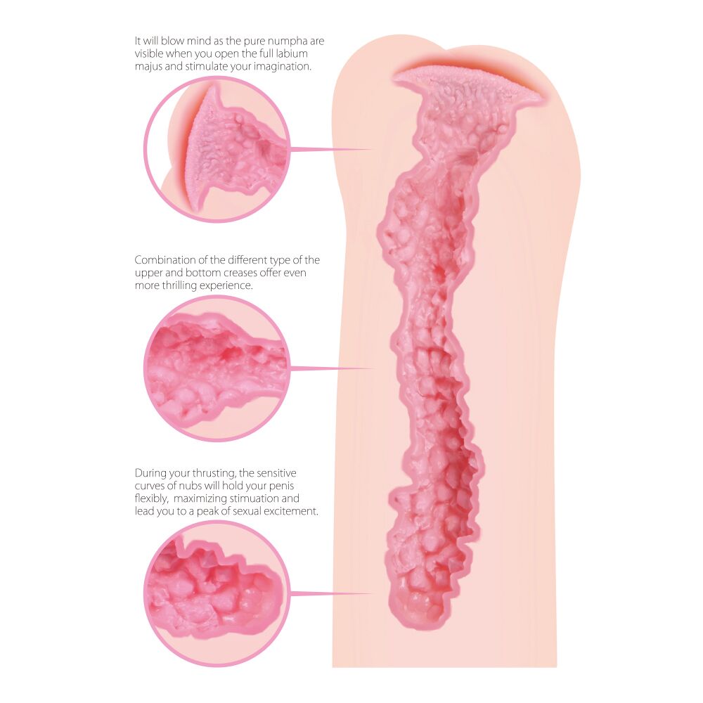 Вхід мастурбатора оформлений так, щоб візуально нагадувати жіночі інтимні зони, а всередині вас чекає багата текстура, яка поступово змінюється, даруючи хвилюючі та різноманітні відчуття під час кожного руху.